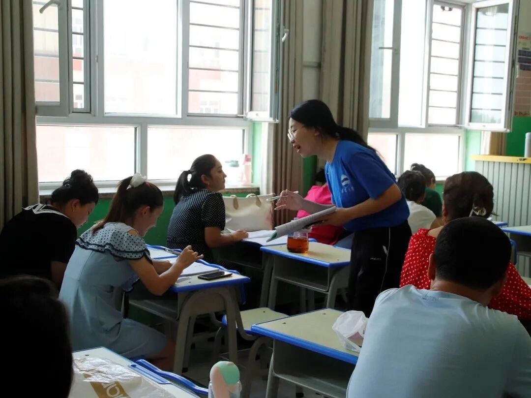 队员们接到参训名单后马上对疏勒县200位幼儿园、中小学参训教师的普通话水平进行测试,按照ABCD四个等级,将参训教师分成四个大班,每个班配备语言学专家教师和学生助教,负责课程教学与作业批改、反馈等。