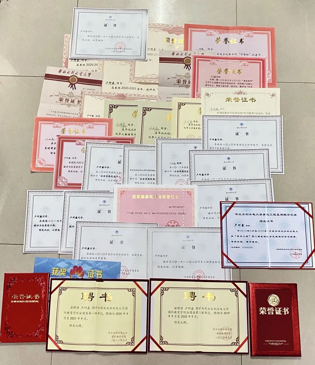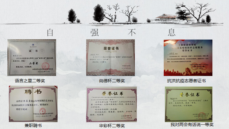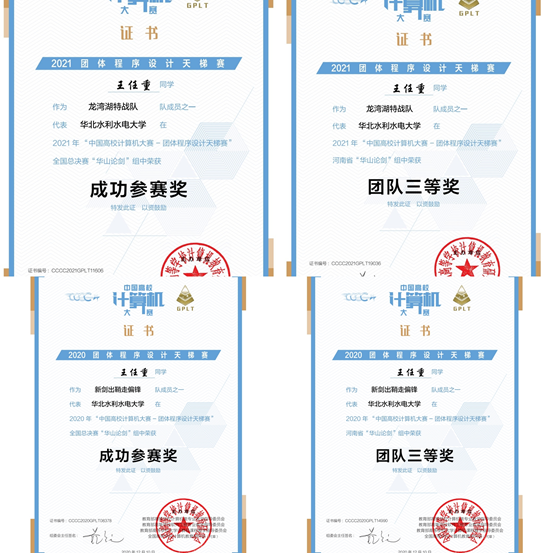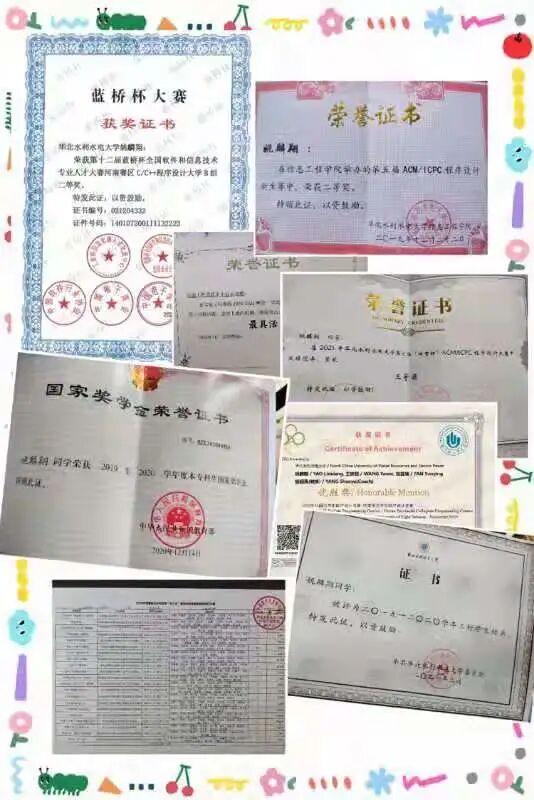 个人曾获国家奖学金,ACM新生赛二等奖、职业生涯规划大赛三等奖、蓝桥杯省级二等奖,全国大学生英语竞赛二等奖,参加过团体程序天梯赛、CCPC省赛。班中的团支书、预备党员,三好学生,三好学生标兵,优秀团干。除此之外,她认为大学也不能将兴趣、爱好与锻炼交友落下。大一大二学年至今为大学生艺术团的一员,大二学年为校啦啦操队的一员,暑假参加了河南省啦啦操比赛。