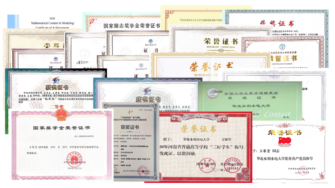 王馨莹,中共党员,曾获国家奖学金、国家励志奖学金、美国大学生数学建模比赛M奖(一等奖)、全国大学生节能减排社会实践与科技竞赛国家级三等奖、河南省“三好学生”荣誉称号、河南省“互联网+”大赛二等奖3项、全国大学生数学建模比赛河南省二等奖、 “挑战杯”河南省大学生课外学术科技作品竞赛二等奖2项、 校优秀团干部、 校级“三好学生”称号、校级“三好学生标兵”称号、社会实践先进个人、校抗击疫情先进个人、校水利创新设计大赛二等奖、华彩杯优秀奖、校运动会学生组女子800m第三名、计算机设计大赛校级三等奖、2020年杰出校友奖学金、校文明学生、校优秀学生党员。曾担任华水学工网络文化工作室校审部成员、办公室副主任、水利学院学生助理。