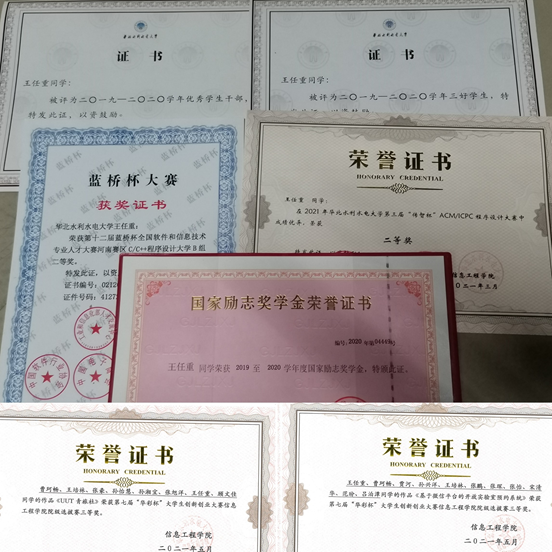 王任重,男,华北水利水电大学19级软件工程专业本科生。预备党员,学习上,大一学习积分第6综合积分第3并获得了国家励志奖学金,大二学习积分第1综合积分第2并获得了国家奖学金。工作中,担任班长一职,认真负责,任劳任怨,热心助人,获得老师和同学们的一致认可与好评,多次获得优秀学生干部、三好学生等荣誉称号。思想上,坚决拥护中国共产党的领导一直积极学习党的思想与纲领,已成为一名光荣的预备党员。我还积极投身于各种科研学术竞赛中,获得主要奖项如下:2020年团体程序设计天梯赛省级三等奖、2021年蓝桥杯省级二等奖、2021年团体程序设计天梯赛省级三等奖、2021年计算机设计大赛省级三等奖、2021年中青杯数学建模大赛二等奖、2021年互联网+大赛省级二等奖。