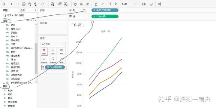 度量就是数据表中的数值数据,维度是类别数据