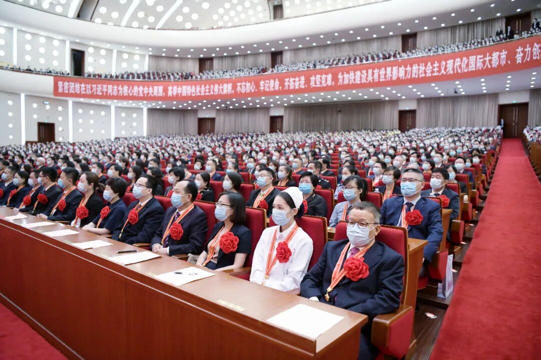 市领导向市优秀共产党员、优秀党务工作者和先进基层党组织代表颁奖。中国工程院院士、同济大学土木工程学院教授吕西林,中山医院青浦分院呼吸与危重症医学科护士长王菊莉作为市优秀共产党员代表作了发言。