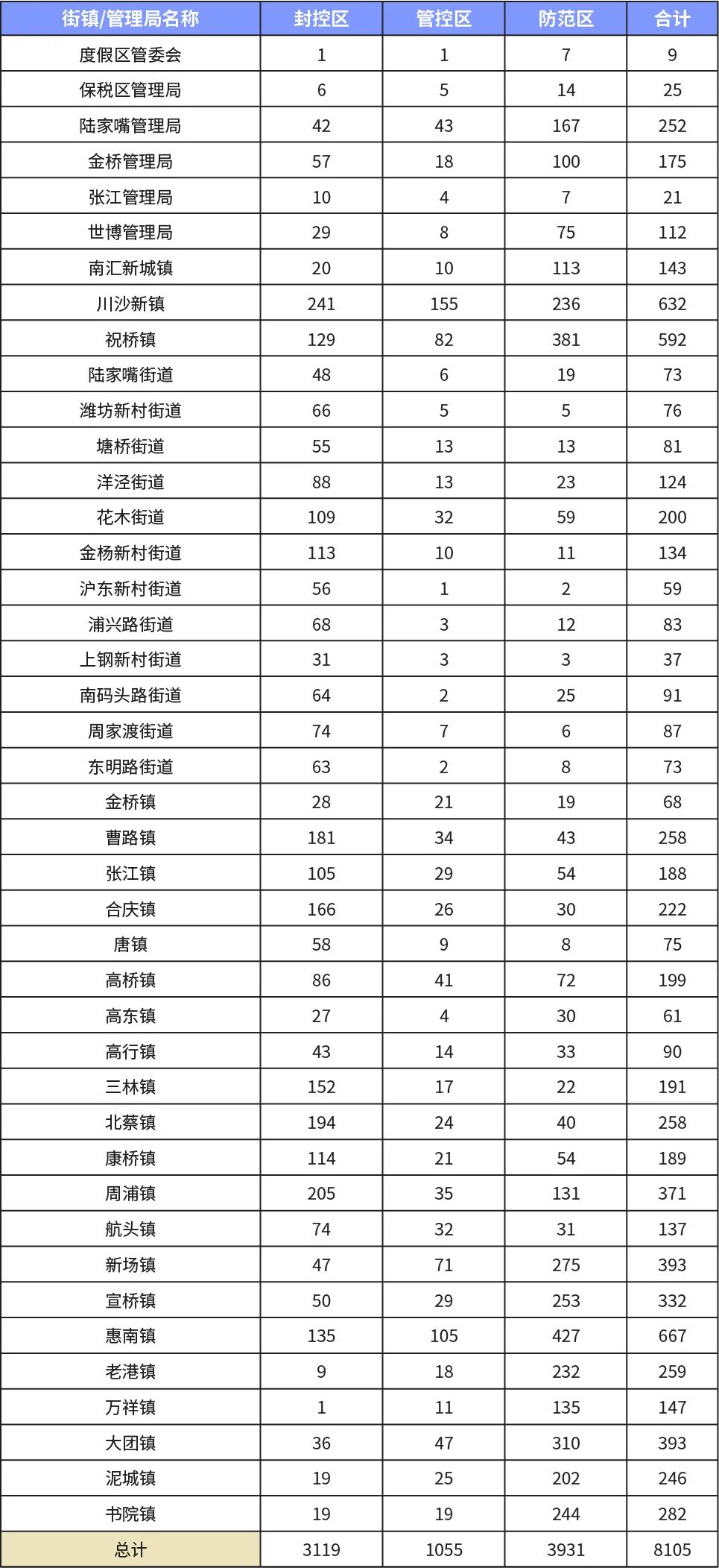 截至2022年4月19日13时,根据筛查结果和风险研判,浦东新区第二批“三区”名单8105个,其中封控区3119个,管控区1055个,防范区3931个。从今日起,各街镇会陆续公布第二批“三区”划分的具体名单,后续“三区”名单还将及时划定并公布。具体名单以各街镇公告为准。