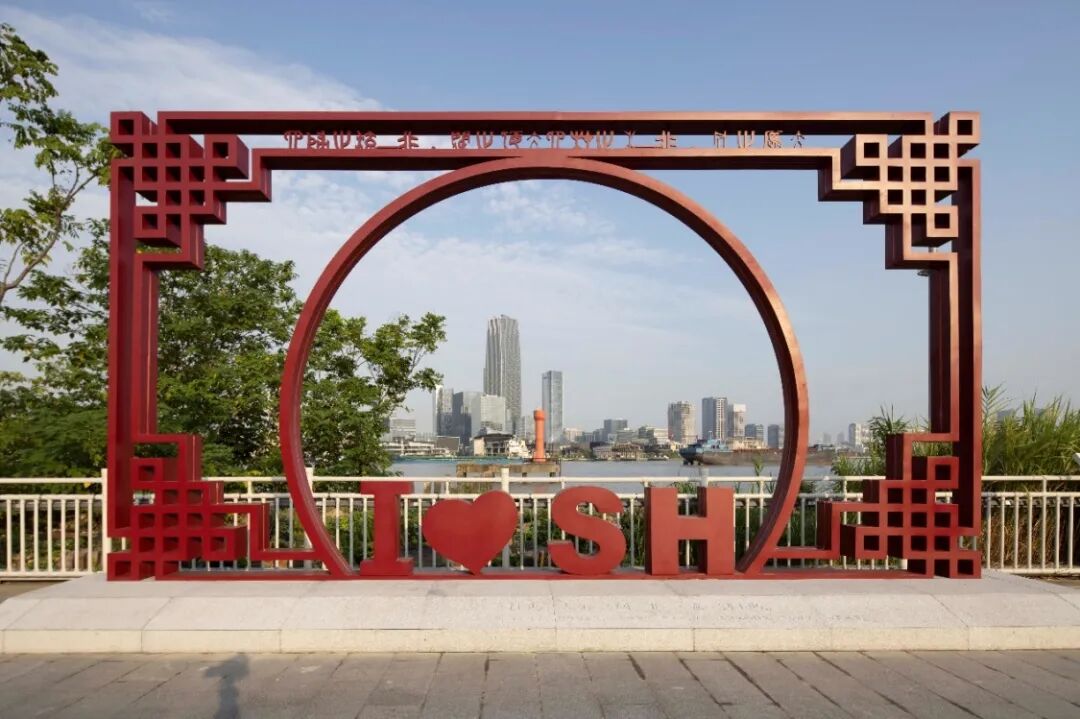 设计采用园林“框景”为灵感来源,提取商朝常用云雷纹,融入中国剪纸,形成独具中国特色的红色打卡装置。通过借景手法,将黄浦江对岸的大厦风光纳入取景框内。
