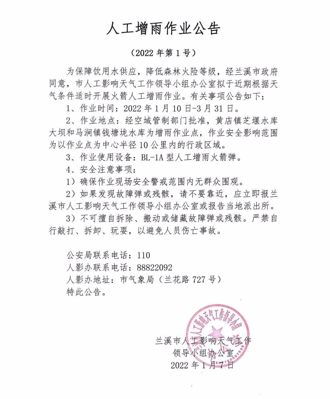 兰溪市人工影响天气工作领导小组办公室拟于2022年1月10日至3月31日根据天气条件适时开展火箭增雨作业,特此公告。