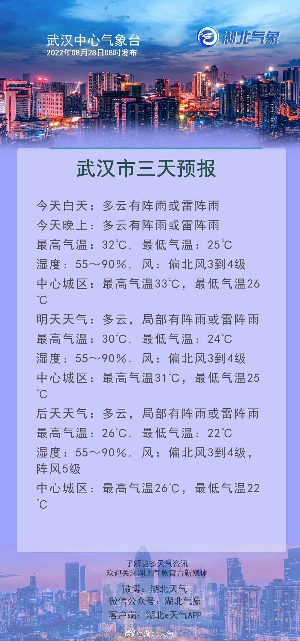 最高气温:鄂西北22~25℃;鄂东南31~34℃;其他地区27~30℃