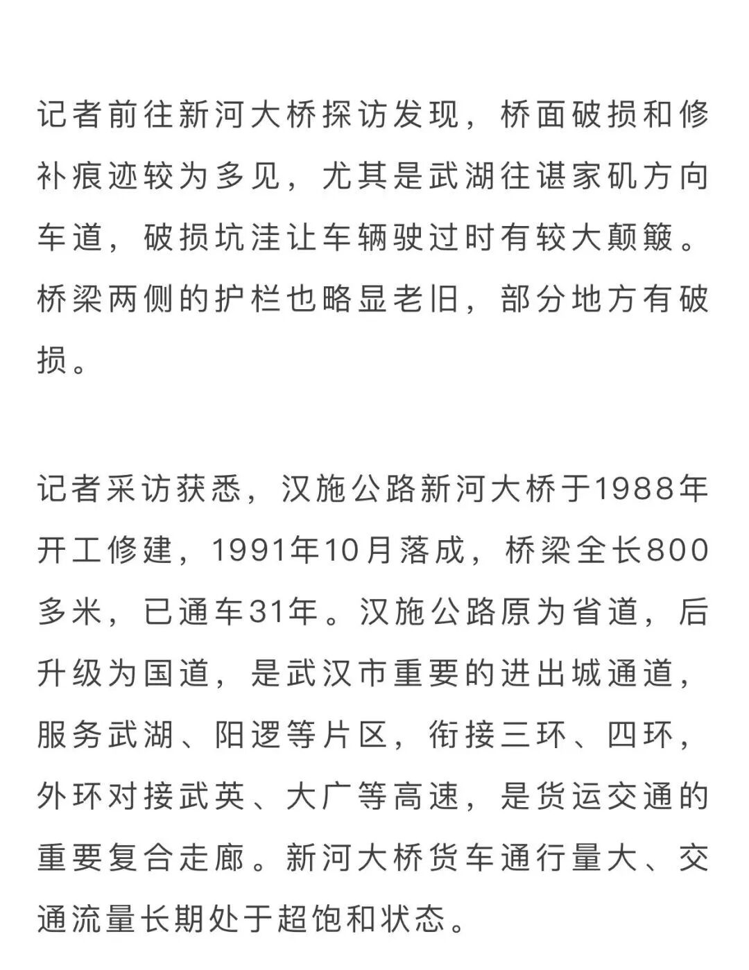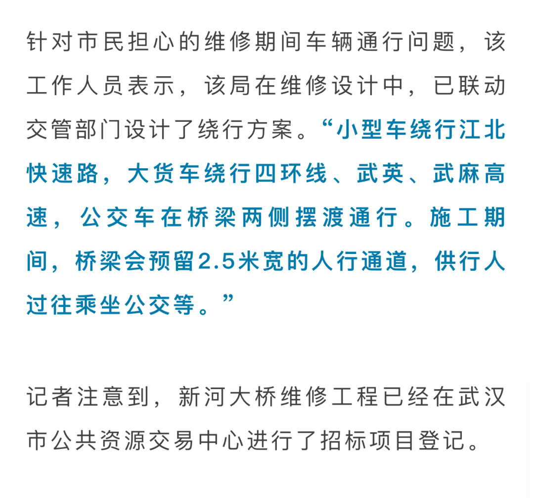 该局相关工作人员介绍,根据维修设计,此次大修将对桥梁进行封闭施工,进行桥面铺装更换、栏杆更换、桥梁梁板结构加固等维修工作。“预计维修工期在3个月左右,最快10月底就开工、春节前完工。”