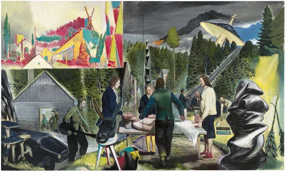 A:幽暗森林里的一片空地上,几个穿着军装和中世纪服装的人无助地围着一个躺在床上的病人。病床前面的三角凳上放着一只驴头。左前方的地面上长着几个巨大的蘑菇,右前方站着死神一般的形体。天上出现一艘外星人的UFO,左上角是类似仲夏夜之梦的独立画面。这是德国当代艺术家尼奥·劳赫(Neo Rauch)的作品《疗愈之地》(Healing Glade)。在他的作品里总能找到历史、现实与未来的奇幻融合,如同充满隐喻的梦境。