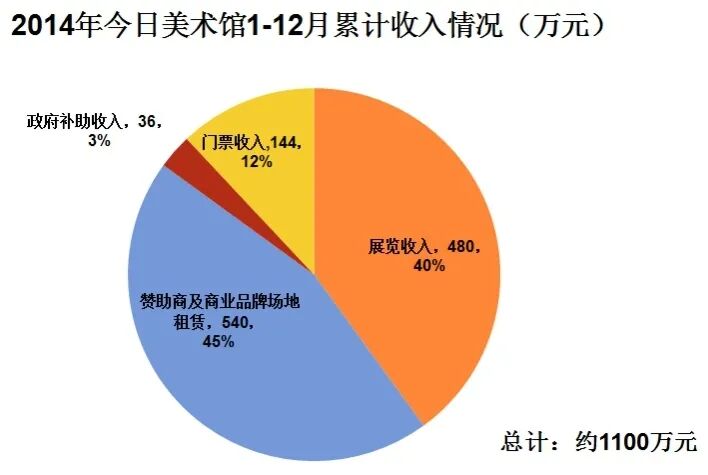 正如之前提到的,馆长上任后,面临的第一个问题就是资金压力。以今日美术馆2014的收入和支出为例,全年必须要有1100万以上的收入,才能保持美术馆的基本运营。