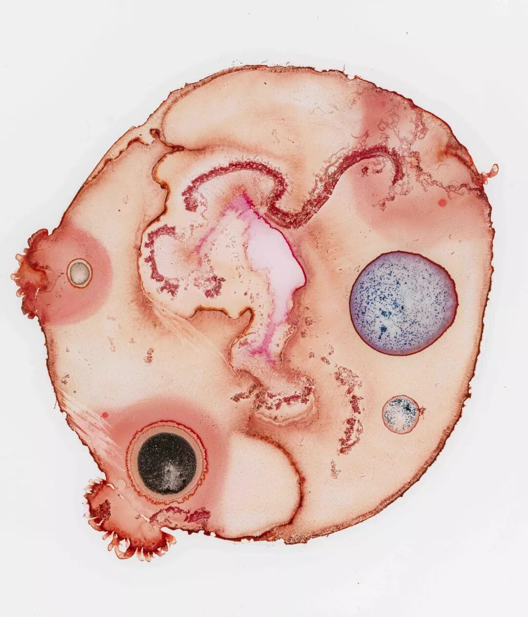 在《原》系列中艺术家用生物色素、矿物颜料、水和不同浓度的乙醇调试成不同不同浓度的液体颜色, 然后把他们滴在2.4*2.4cm 的玻璃片上, 在它们自由扩散的过程中,由于彼此之间不同的融合度而生成不同的图像。这些类似细胞质一样流动中孕育神秘的生命。