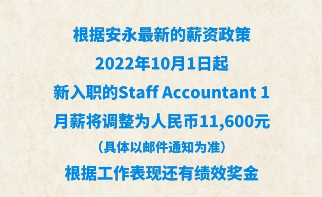 安永上月官宣,自10月1日起,新入职Staff Account 1的月薪调整为11600元人民币,较去年上涨10%,根据工作表现还有绩效奖金。