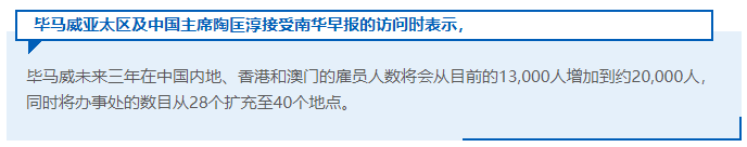 毕马威亚太区及中国主席陶匡淳2021在接受采访时表示:未来三年在内地、香港和澳门的雇员人数将会从13,000人增加到约20,000人,同时将办事处的数目从28个扩充至40个地点。