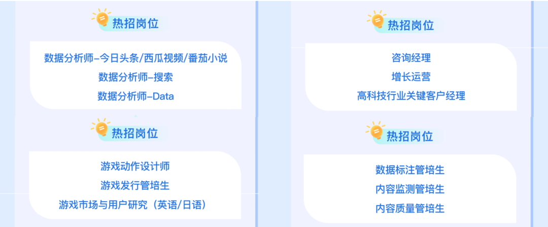 本次字节补录包含抖音、飞书等大业务团队4大职类、70+岗位方向、2次投递机会涵盖管培生/数据/运营/产品/咨询等核心岗,需要注意的是,已经投过2次就不可以再投递了。