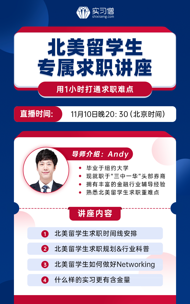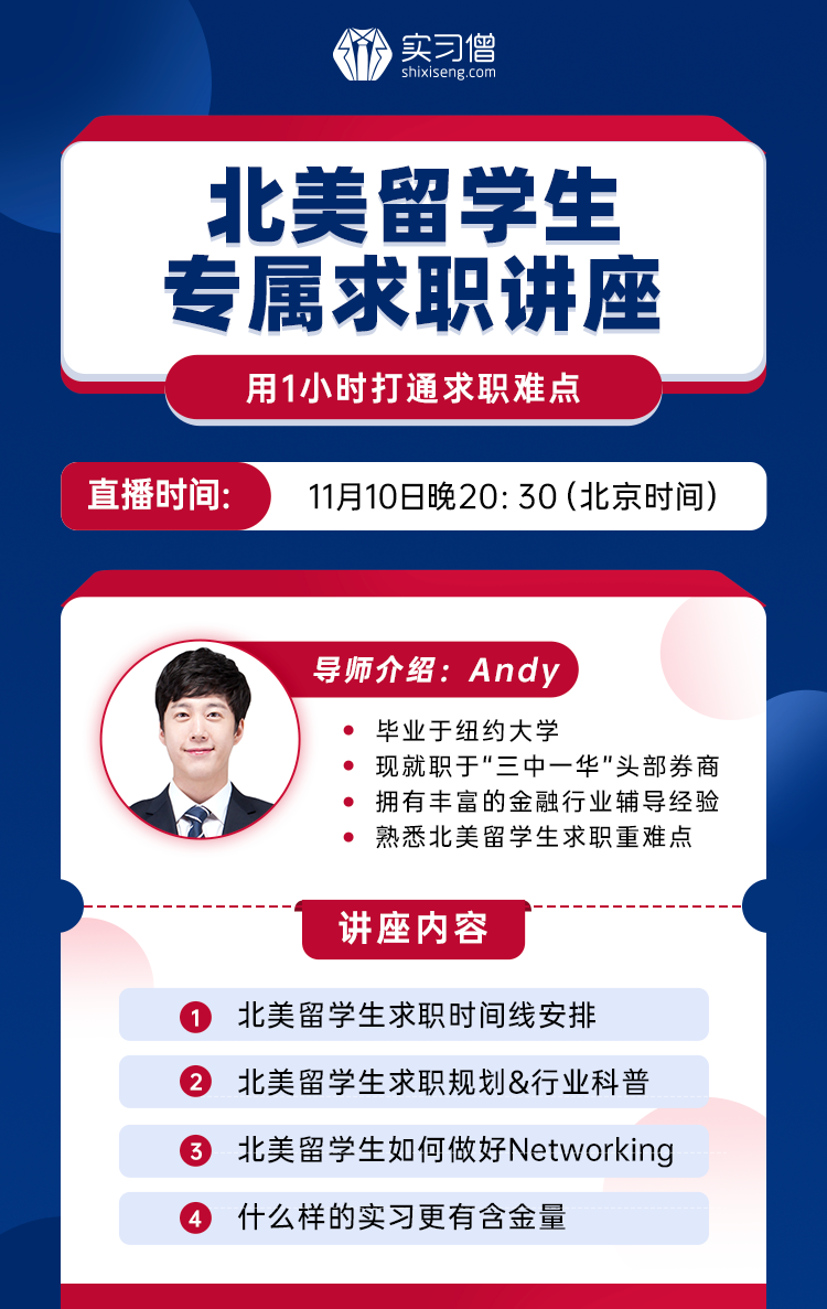 本次邀请的Andy老师,毕业于纽约大学,熟悉北美留学生求职的重难点,会以过来人的身份告诉同学们应该做好哪些求职准备,企业喜欢怎样的北美留学生...