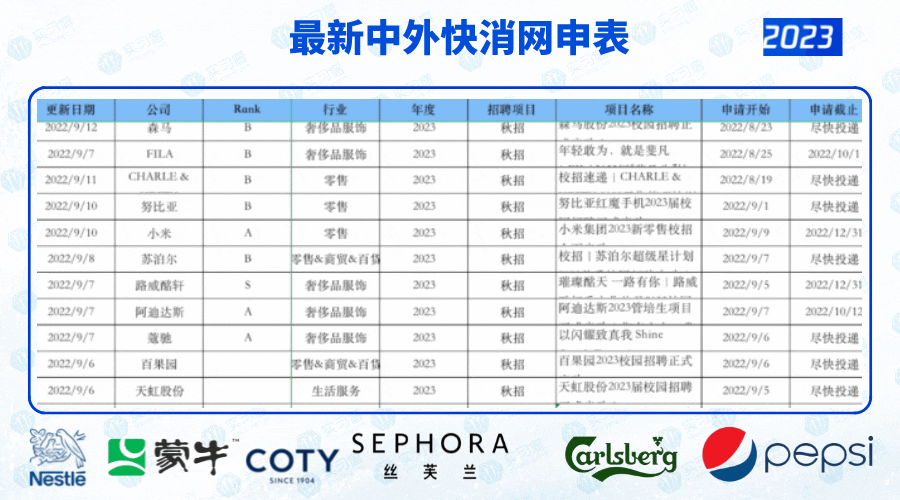 进快消也是有技巧的,获取最新招聘信息。这里准备了一份快消秋招网申表,在招国内外快消名企,一网打尽,从应届身份鉴定,到网申开始结束日期,全部囊括,外加从简历到笔面试都有的快消大礼包,手把手教你入职快消名企。
