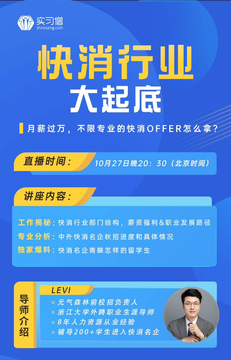 本次我们邀请了实习僧金牌导师Levi来和同学们讲解,快消名企喜欢怎样的留学生?无论你是: