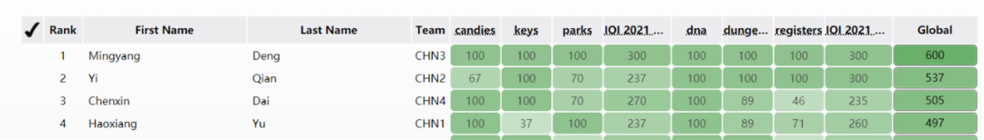 根据IOI2021官方发布的赛事总积分榜单显示:四名中国队选手分列1至4名,团队总成绩第一!