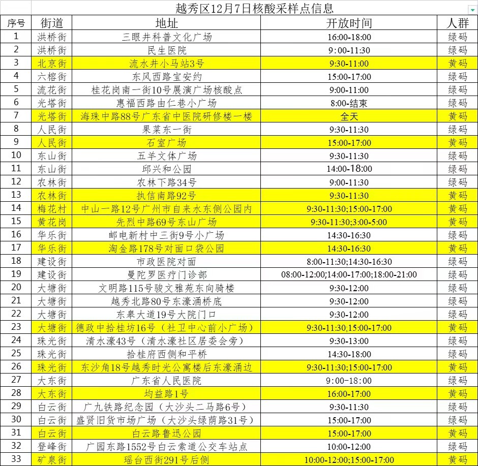根据工作需要,荔湾区对12月7日部分街道便民免费绿码、黄码核酸采样点进行调整,具体安排如下(如遇天气变化等原因可能会临时取消或再调整):