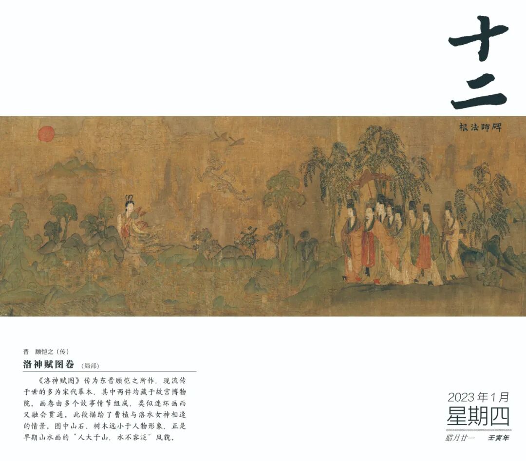 在春季,我们将在日历中欣赏到文徵明《湘君湘夫人图》、顾恺之(传)《洛神赋图》、费丹旭《十二金钗图》、唐寅《王蜀宫妓图》等名作,一睹那些花容月貌、飘举如仙的佳丽;