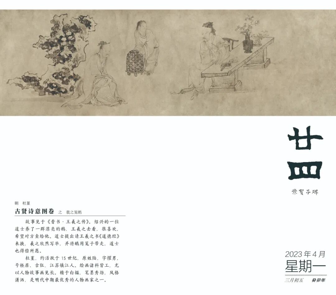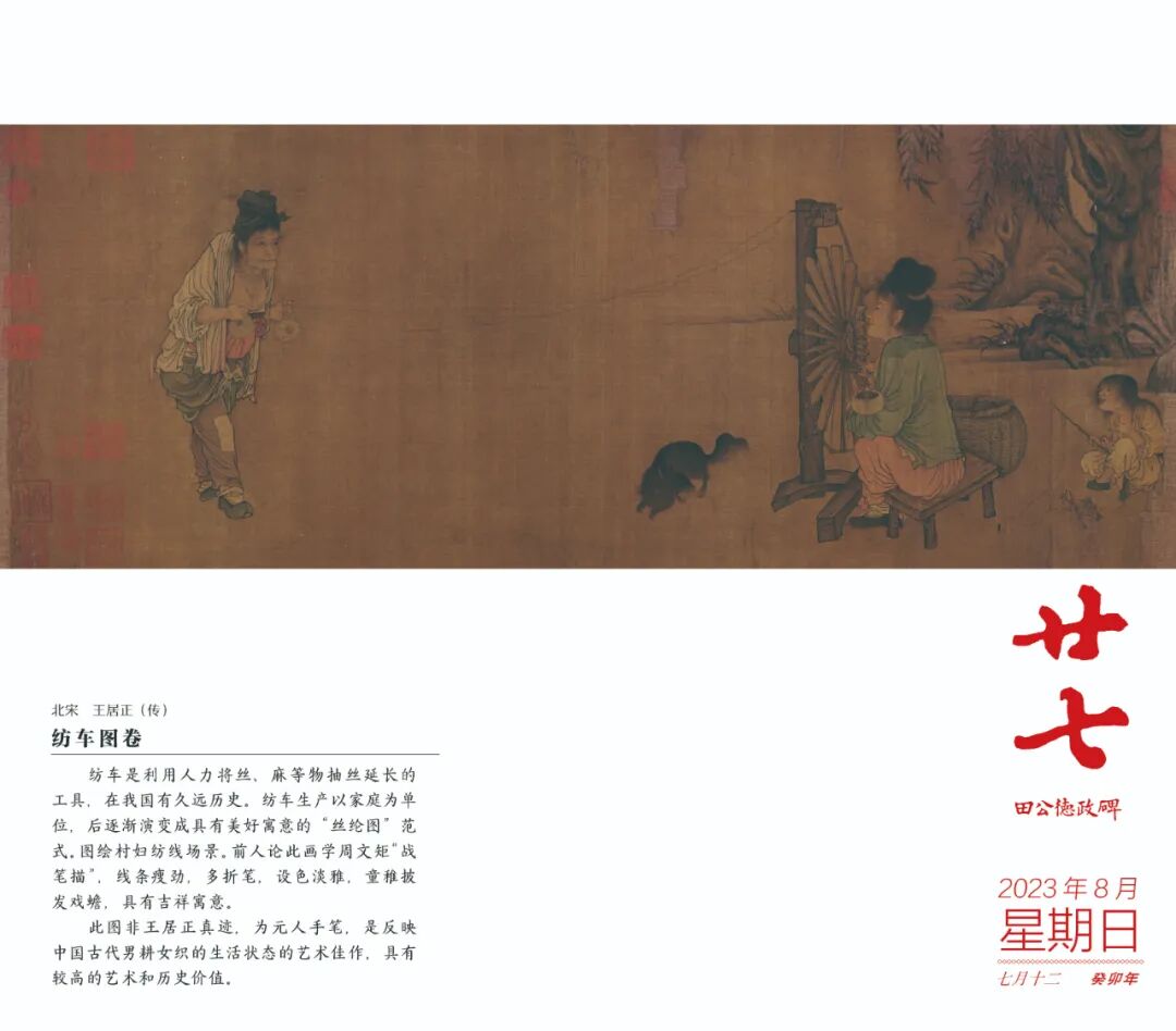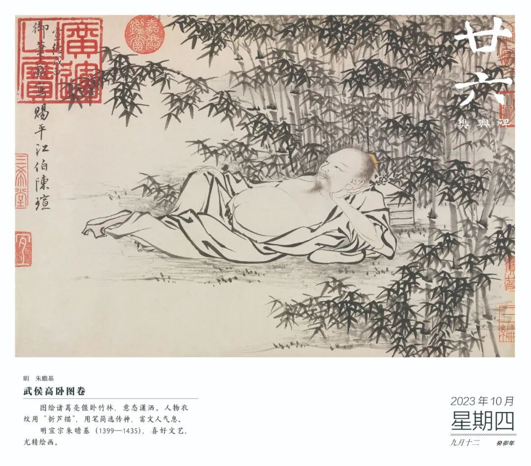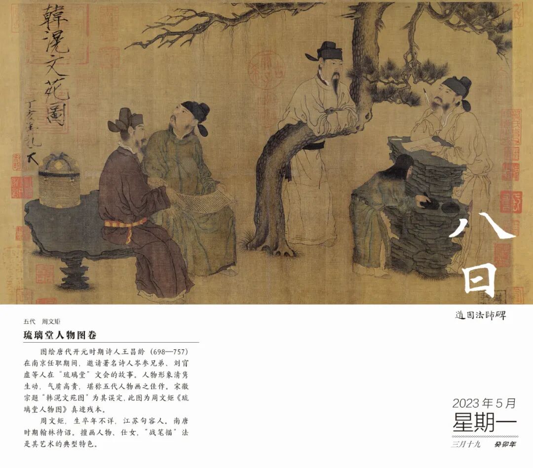 夏季,我们可以从日历中欣赏到描绘坚贞不屈的伯夷、叔齐故事的李唐《采薇图》、描绘“高山流水”、千古知音的王振鹏《伯牙鼓琴图》;也有表现苏东坡事迹的马和之《后赤壁图》、呈现唐代大诗人王昌龄诗会的周文矩《琉璃堂人物图》;