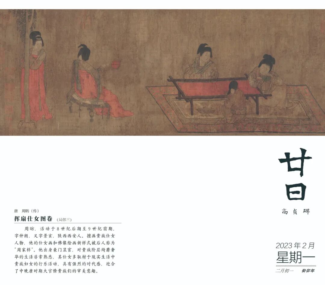 2023年《故宫日历·书画版》由故宫博物院书画专家杨丹霞主编,撰稿作者来自 “故宫博物院藏古代人物画展”的策展团队。2023年《故宫日历·书画版》以“千秋佳人”“林下风雅”“众生百态”“庙堂仪范”作为四季的主题,通过一幅幅珍贵的画作,讲述了闺阁佳丽、逸士高隐、市井生活、明君贤臣的典故或故事,为我们了解古人思想情趣、生活状态提供了生动鲜活的形象和史料。