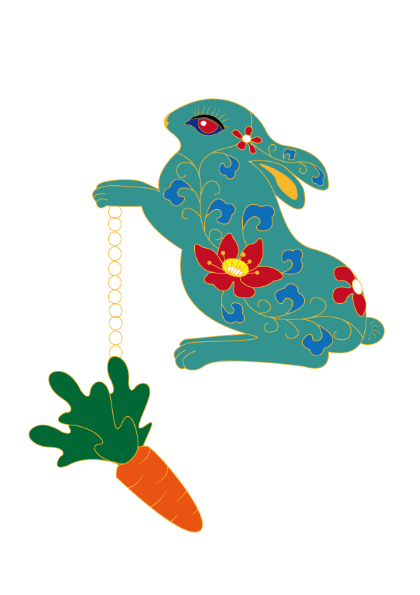 徽章造型源自故宫博物院所藏明代《双兔图》页;兔耳、兔身装饰图案,取自宫廷珐琅器的缠枝花纹样,寓含美意绵连,福气不断。