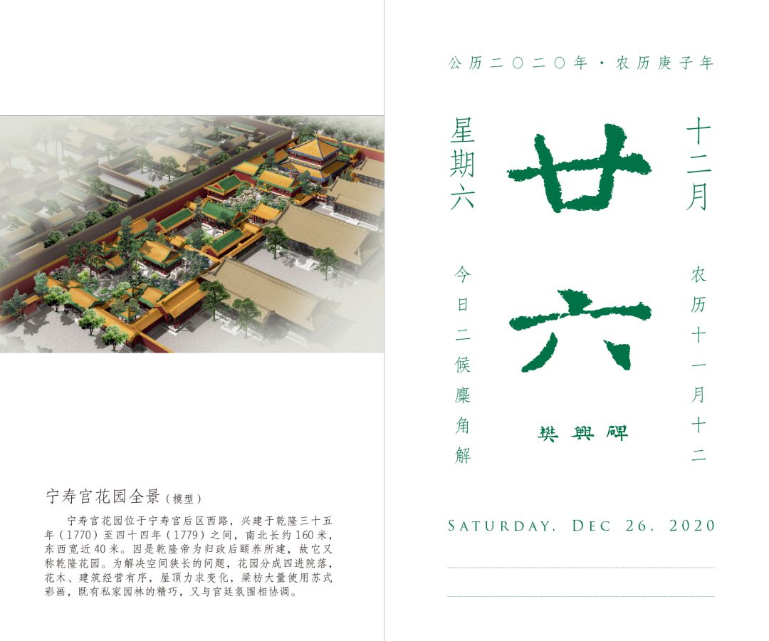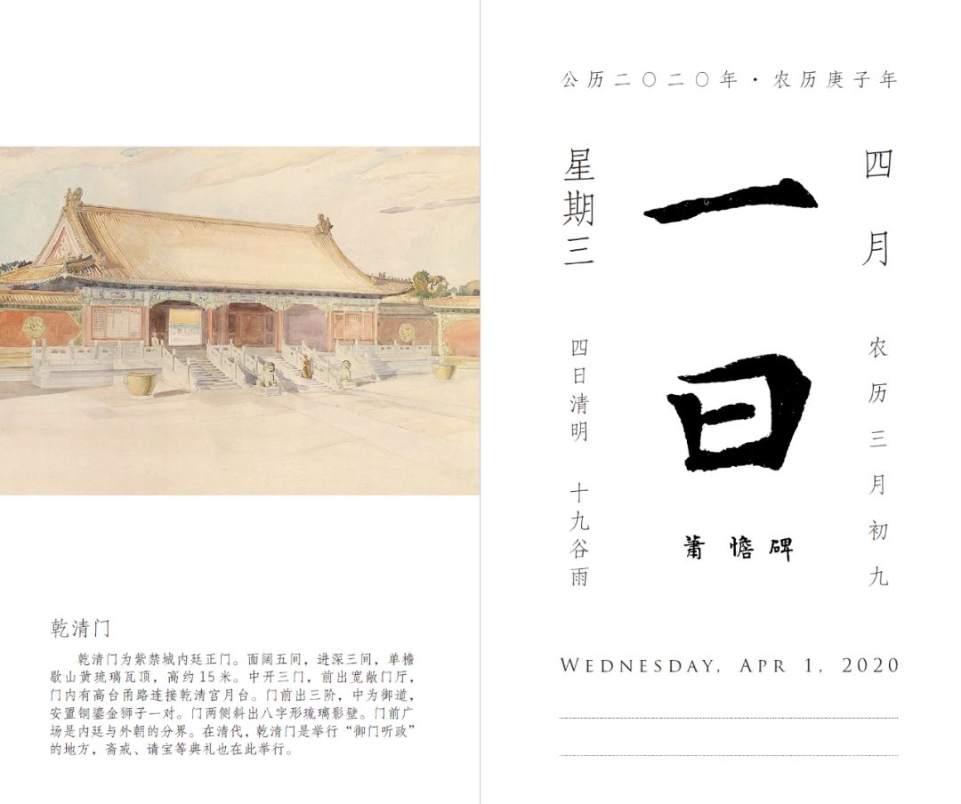 《故宫日历·2020》将引领大家完成一次纸上故宫之旅,全览紫禁城建筑之美,回顾明清两朝宫廷往事。本书在图片的选取上,既放眼宏观,有宏观展示故宫古建筑的摄影图、老照片、测绘图等,以不同多角度呈现紫禁城之美、历史之厚重;又不失细节,带领读者发现不曾关注又颇有故事的小细节,如坤宁宫前的索伦杆底座,长春宫游廊壁上的《红楼梦》壁画,翊坤宫廊下的秋千环……展现出一幅有全景有细节、有历史有文物、有人物有故事的紫禁城六百年历史画卷。《故宫日历》从最初的默默无闻到如今再次风靡一时,可能最主要的就是它将传统文化和古代艺术带进了大众的生活,唤起并努力回应大众对于从历史、文化、美学、情感角度共享文化遗产的内在需求,在一定程度上实现了艺术熏陶与文化浸润的日常化。