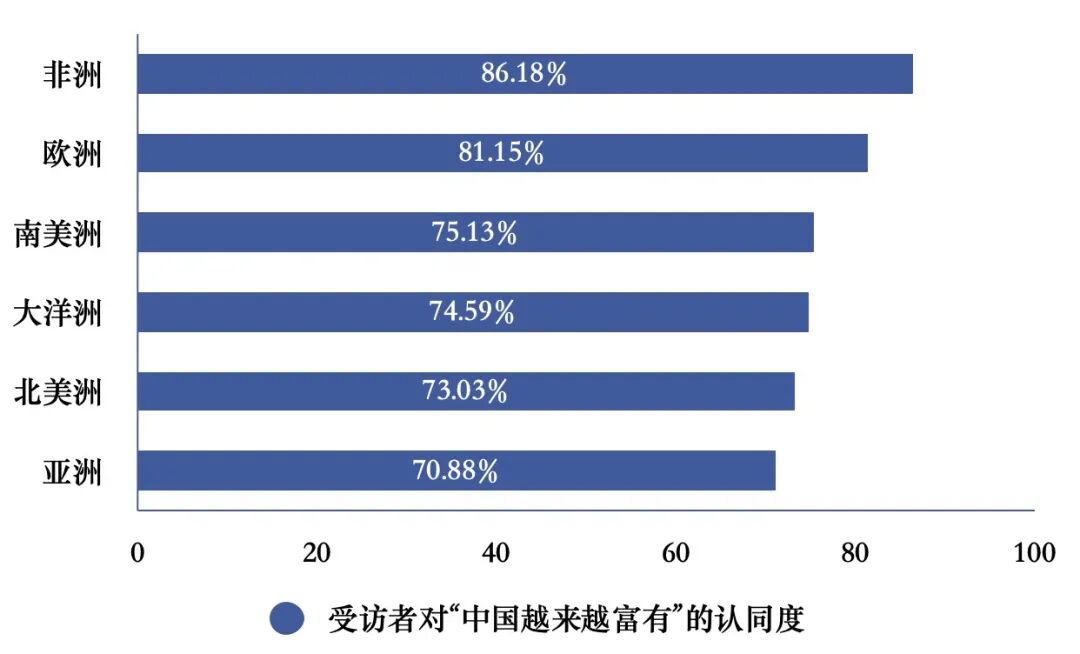 过去十年,中国有近一亿农村贫困人口全部脱贫,书写了人类反贫困史上的奇迹。在脱贫攻坚取得历史性成就的诸多原因中,绝大多数全球受访者认为,“中国经济保持快速增长”和“中国领导人很有决心,坚定地向着目标迈进”是排名前两位的最主要因素。全球民调中,绝大多数受访者对中国人的印象较为正面,其中“勤劳刻苦,有上进心”列第一位,有84.42%的非洲受访者和71.18%的欧洲受访者对中国人的这一传统美德印象深刻。此外,70.96%的“一带一路”沿线国家和74.26%的发展中国家受访者表达了同样的观点。在对中国人的印象当中,“爱国,对自己的祖国和文化很自豪”位列第二位,认为中国人“越来越自信”的印象排名第三。The overwhelming majority of respondents had a positive impression of the Chinese people, and 84.42 percent of African respondents and 71.18 percent of European respondents believed the Chinese people are hard-working and self-motivated. Meanwhile, 70.96 percent of respondents from countries along the BRI and 74.26 percent of respondents from developing countries expressed the same view.“一带一路”国家和非“一带一路”国家、发展中国家和发达国家对中国人“勤劳刻苦,有上进心”认同度对比当今科技飞速发展,中国的科技进步给全球受访者留下深刻印象。其中,受访者印象最深刻的是我国“第五代移动通信技术(5G)的发展”,在非洲比例达到73.87%。此外,给各国受访者留下深刻印象第二位的是“人工智能”,第三位的是“高速铁路”。在欧洲,52.77%受访者对中国人工智能技术的进步印象深刻。在非洲,55.28%的受访者对中国的高速铁路表达了赞誉。There are nearly 100 million people in rural China who have been lifted out of poverty in the past decade, and the vast majority of global respondents believed top two reasons for the historic achievement in poverty alleviation are that China's economy maintains rapid growth and that Chinese leaders are determined and firmly marching toward their goals. In terms of the rapid technology development, respondents were most impressed by China's 5G development, artificial intelligence and high-speed railway. In Africa, 73.87 percent of respondents were most impressed by China's 5G, and 55.28 percent of respondents praised the country's high-speed railway. In Europe, 52.77 percent of respondents were impressed with the country's progress in artificial intelligence. 各大洲受访者对中国“第五代移动通信技术的发展”印象深刻的比例据了解,此次民意调查各国受访者比例相对均衡,全球受访者平均年龄38.64岁,54.71%的受访者为大学本科及以上学历,其中硕士、博士占比15.22%。