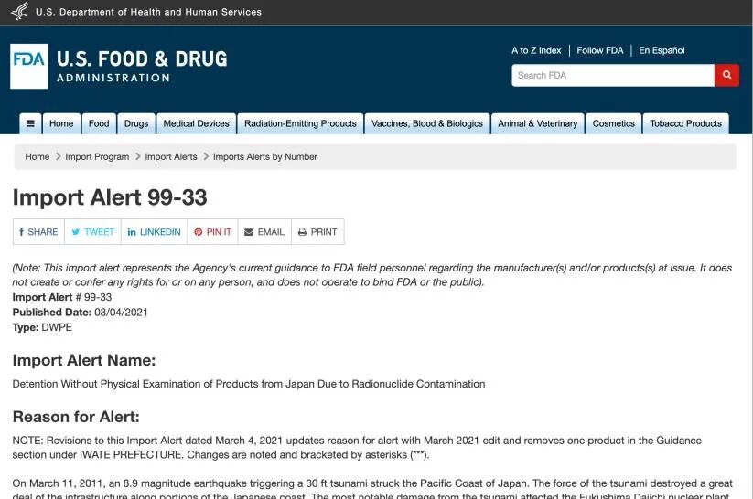 但是美国却说一套做一套。美国食品药品监督管理局在4月3日发布“进口警告”,表示因放射性元素污染问题,禁止来自日本某些地区的产品进入美国。The U.S. Food and Drug Administration issued an "Import Alert" on April 3 to detain products from Japan due to radioactive contamination.