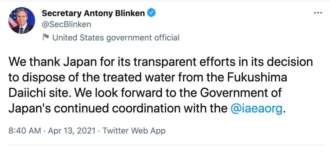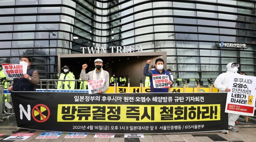 当地时间2021年4月16日,韩国首尔,在日本驻韩国大使馆前,韩国渔业商人抗议日本政府将核污水排入大海的决定。/CFP How did the world react?The decision of the Japanese government aroused strong opposition from its own people and people in its neighboring countries including China, South Korea and Russia.People in Japan and South Korea took to the streets to protest.然而,美国国务卿布林肯却在推特上发文感谢日本政府的决定。“我们感谢日方在决定处理福岛第一核电站处理水问题上所做出的显而易见的努力。我们期待日本政府继续与国际原子能机构进行协调。”However, U.S. Secretary of State Antony Blinken took to Twitter to "thank" Japan for its decision.