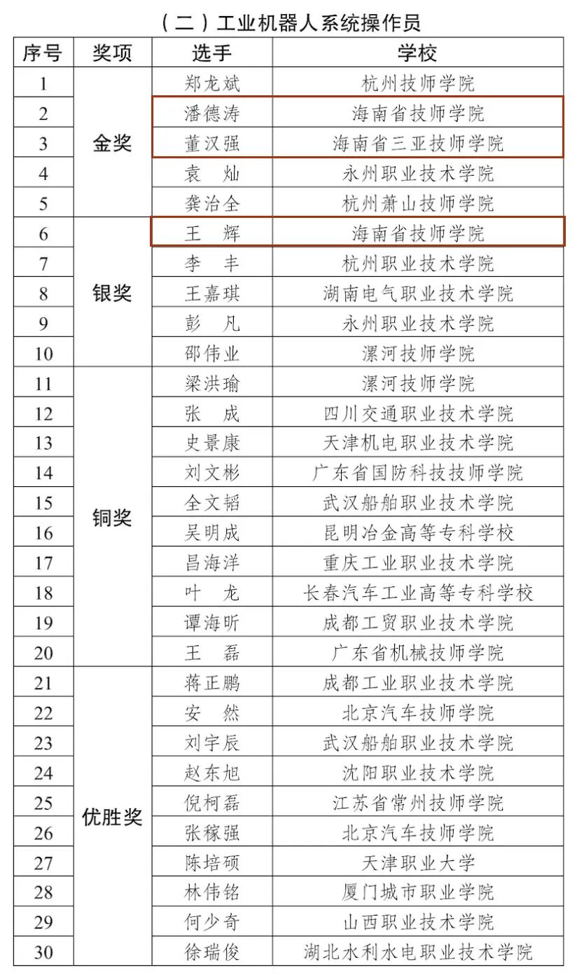 经过决赛激烈的角逐,由共青团海南省委选派的5名参赛选手从全国219名选手中脱颖而出,斩获两金一银一铜的好成绩。其中潘德涛、董汉强分别以全国第二和第三的好成绩,获工业机器人系统操作员项目的金奖。王辉荣获工业机器人系统操作员项目银奖,温道博、岑运程荣获计算机程序设计员(云计算平台与运维)双人赛项目铜奖。