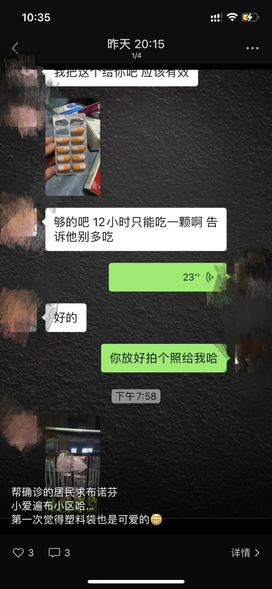 “12月14日下午,杨阿姨给我发微信,让我帮忙打听一下哪里可以买到药。”戴鹏介绍,居民杨阿姨的儿子前些年去世,她的老伴孟师傅患有比较严重的基础病。为了让老两口早点放心,戴鹏主动奔走各个药房,清空了自家药箱,还到父母家里找药,配齐了连花清瘟胶囊、999感冒灵、止咳糖浆等各类药品。
