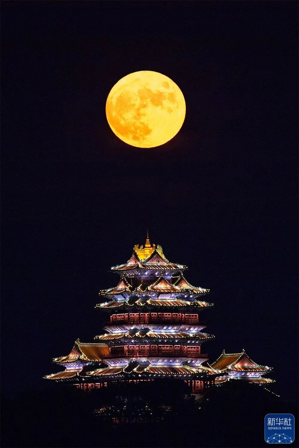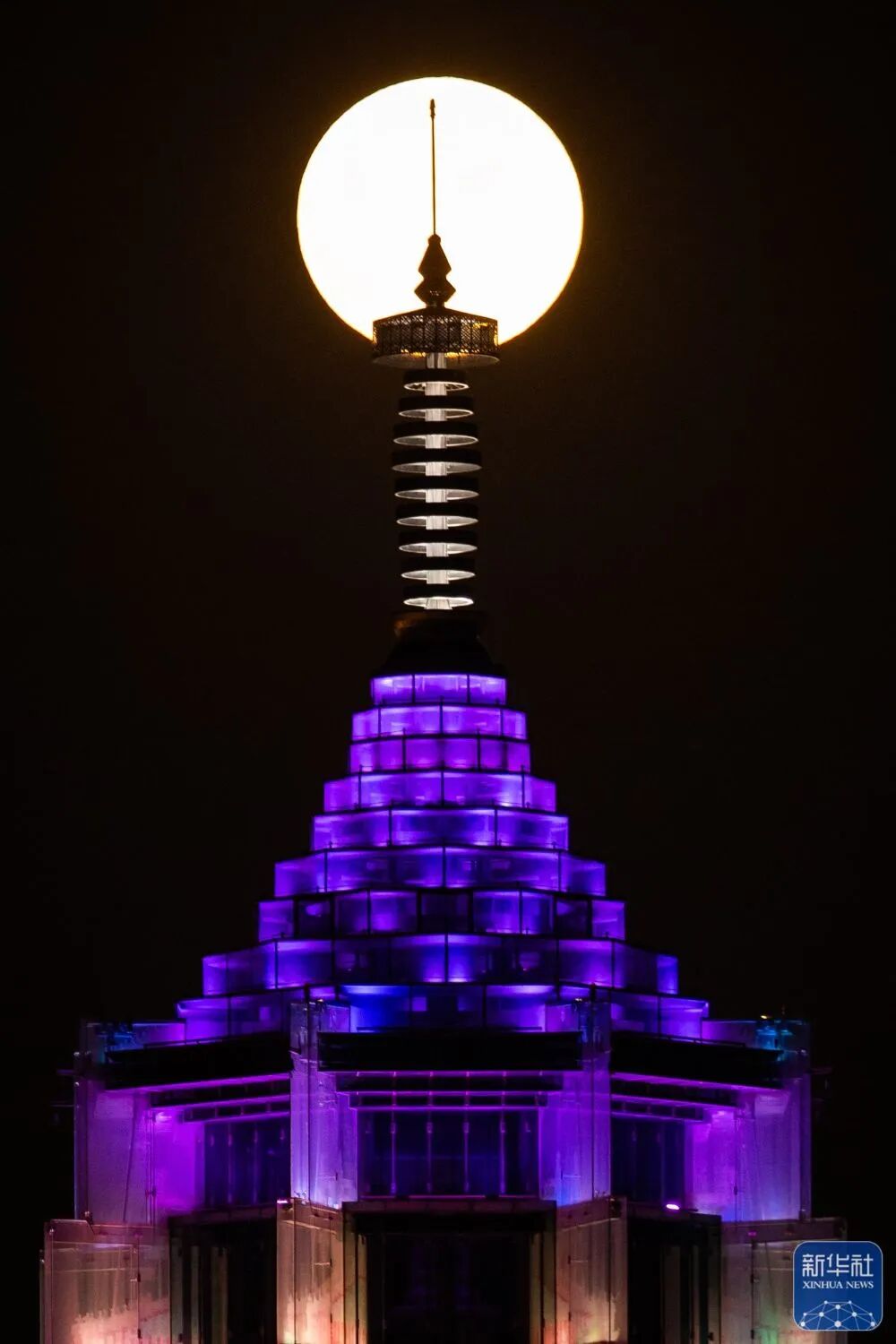 9月10日,圆月与江苏南京大报恩塔相映成景。新华社发(苏阳 摄)
