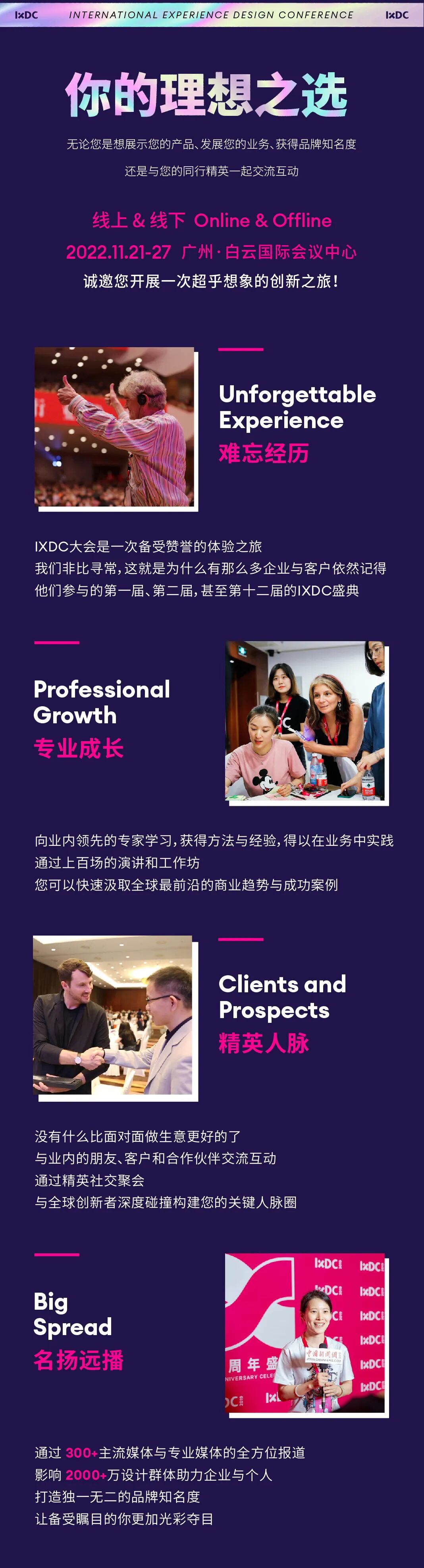 功能介绍 IXDC是全球领先的用户体验创新盛会,致力于探索和分享设计界最前沿的思想和技术,是中国连接世界的跨界创新平台。自2009年起,IXDC发挥“设计外交”作用,搭建跨越国家、文化和语言界限的桥梁,帮助各行业人士获得应对21世纪挑战时的全球视角。
