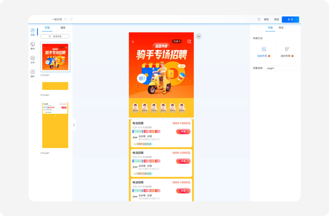 3.快速配置:日常专题产品同学可以一键发布,减少需求排期、协调资源的时间,又保障快读上线时间,只需用招聘自主研发后台10几分钟配置上线,大幅降低开发、测试成本。使用模板化搭建专题,设计提效30%,开发测试节省80%的工作量。