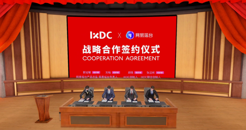 网易瑶台负责人刘柏、网易瑶台产品总监郭冠敏与IXDC创始人胡晓、IXDC联合创始人张运彬共同出席了此次元宇宙签约仪式。