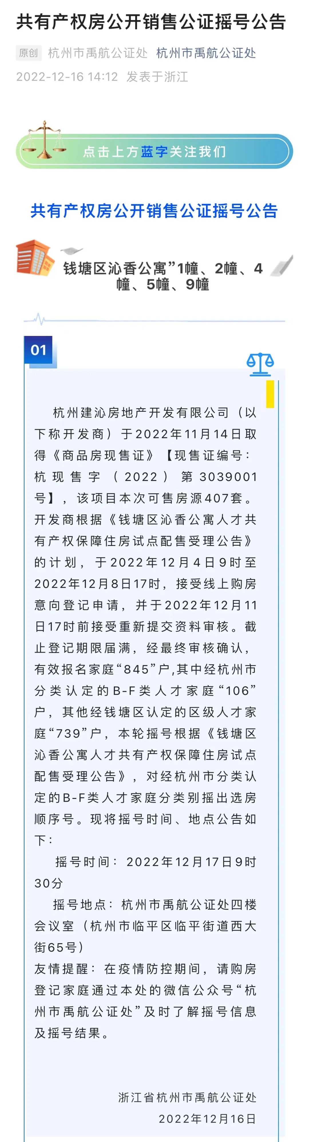 9时30分将对经杭州市分类认定的B-F类人才家庭分类别摇出选房顺序号,定于2022年12月18日