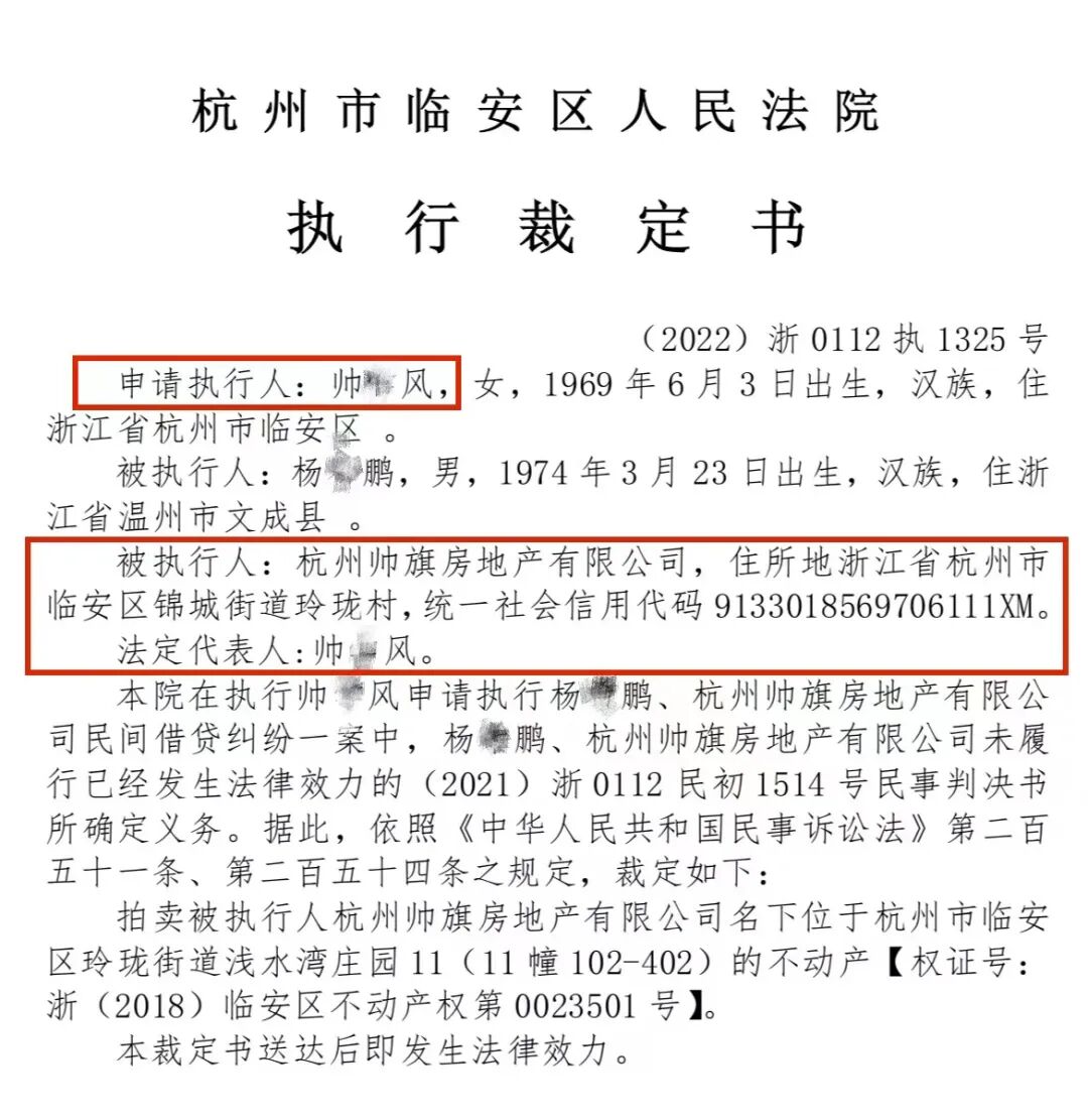 从执行裁定书上可以看到,与杭州帅旗房地产有限公司一起被起诉的,还有一位个人杨某鹏。根据天眼查信息,杨某鹏因为未履行帅某风起诉他与帅旗房地产有限公司相关民间借贷纠纷案的生效法律文书确定的给付义务,已经在今年5月19日被下达了限制消费令;而帅旗房地产有限公司则是名下7套房产被强制司法拍卖。