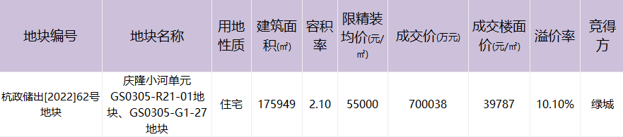 9月15日,今年杭州第三批宅地集中出让,绿城豪掷95.4亿元拿下三宗地块,其中成交价格最高的是庆隆小河单元GS0305-R21-01地块、GS0305-G1-27地块,成交总价为70亿元,成交楼面价39787元/㎡,未来新房精装限价55000元/㎡,与隔壁滨江揽云锦绣里持平。