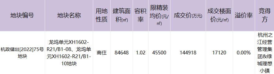 土拍当天,绿城理想小镇与杭州之江经营管理集团一起底价拿下龙坞单元的低密商住地块,成交总价总价144918万元,成交楼面价17120元/㎡,未来精装限价45500元/㎡。