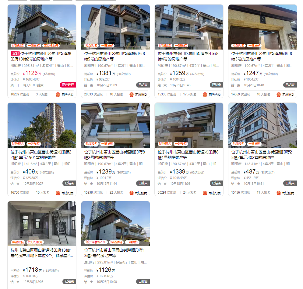 相比之下,10月拍卖的2套湘湖印象高层房源,成交价跟排屋房源简直有云泥之别。其中一套建筑面积141.6m²的房源,以409万元成交,不但低于评估价,而且折合成交单价仅2.89万元;另一套143.31m²的房源,成交单价约3.4万元。