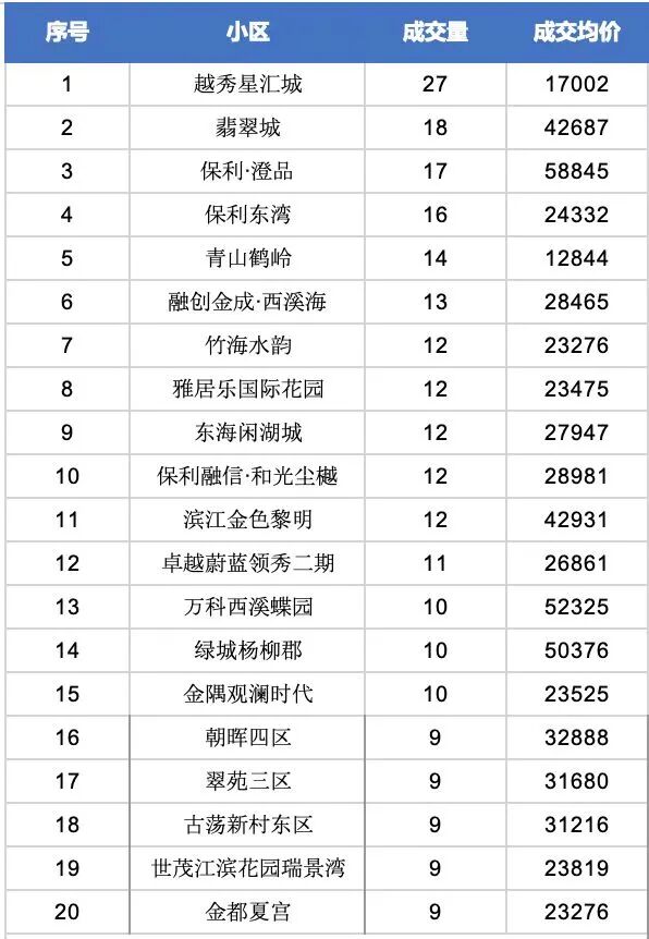 杭州贝壳数据研究院提供的11月二手房成交量排行榜中,朝晖四区、翠苑三区和古荡新村东区三个老小区均回到TOP20,各自成交了9套,签约均价在3.2万元/㎡左右。