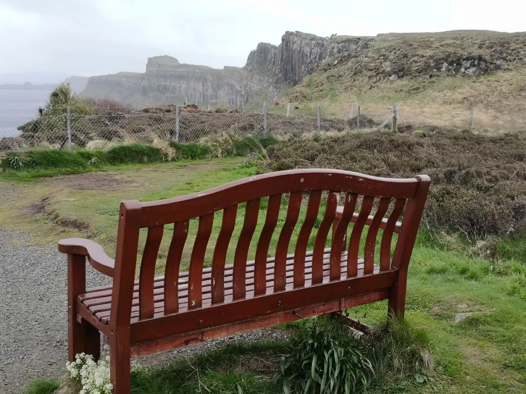 第二天,我们在阴雨绵绵中开车穿过壮丽的荒原,到了斯凯岛的北端。在面向大海的悬崖边上,我又看见了一把椅子,一把非常宽大的椅子。它同样面对着大海,或者说,它把自己的胸膛向着大海敞开。这张椅子的标牌上写着:This bench is dedicated to beloved father and mother.(这张椅子献给敬爱的父母。)这么宽大的椅子,两个身材丰满的人坐在上面仍不觉拥挤。或许,那对老夫妇的灵魂这会儿正裹着一条毯子在其上相拥而坐吧!不知他们生前是否常常携手在海边漫游,而现在,他们可以永无止境地在此聆听海潮轰鸣和海鸥欢唱,尽情欣赏碧蓝的大海和金色的落日。我真的好生羡慕啊!虽然这把椅子看上去有几分孤独,但有大自然的万千气象陪伴,如此单纯的享受,又是如此丰盛的存在,实在是太大的福分了!![]()