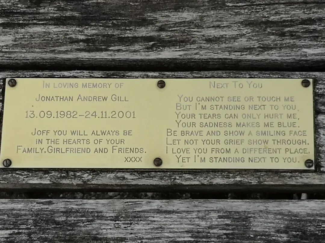 它独处角落,面对海峡,看上去已经老旧,油漆斑驳,木纹暴露。我看了看周围,并无相同的设施,意识到它是一把刻意放置在此的椅子。果然,我在椅子上面看到了一个黄铜铭牌,左边写着: