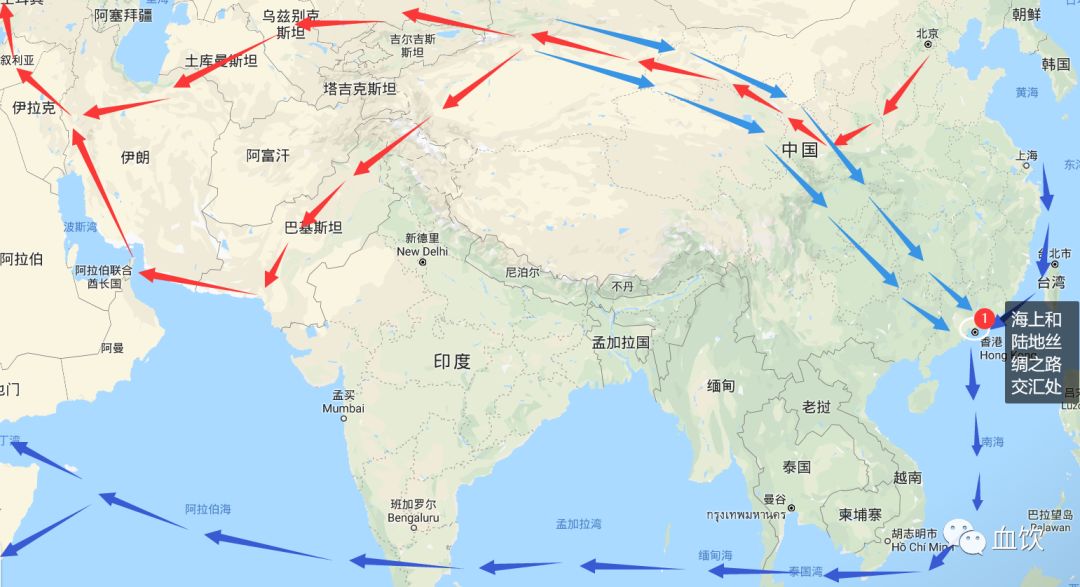 浅蓝色为西部陆海大通道,它连接红陆地(红色)和海上(蓝紫色)丝绸之路,白色圈为陆海交汇处。
