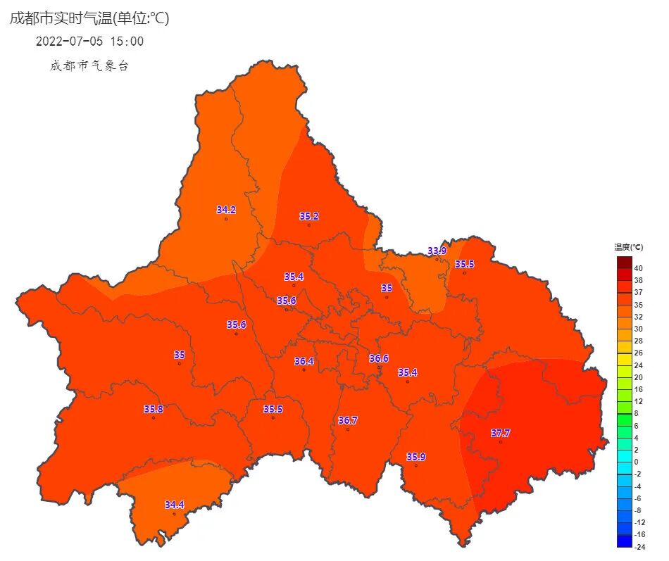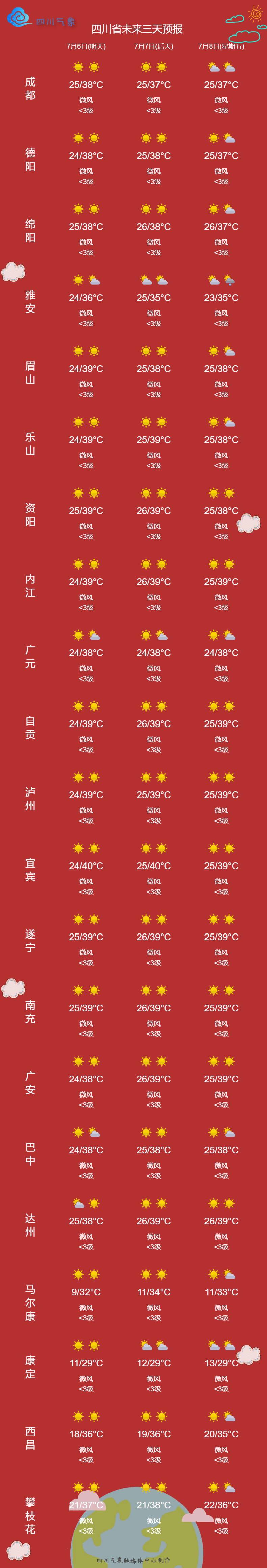 据成都气象,截至7月5日16时,全市最高气温出现在简阳(38.1℃)。预计未来三天天空状况在晴间多云和多云间晴中来回切换,明日阳光关照,日最高气温将达到37℃。随后两天阳光依旧“热晴”,最高气温都在36℃。