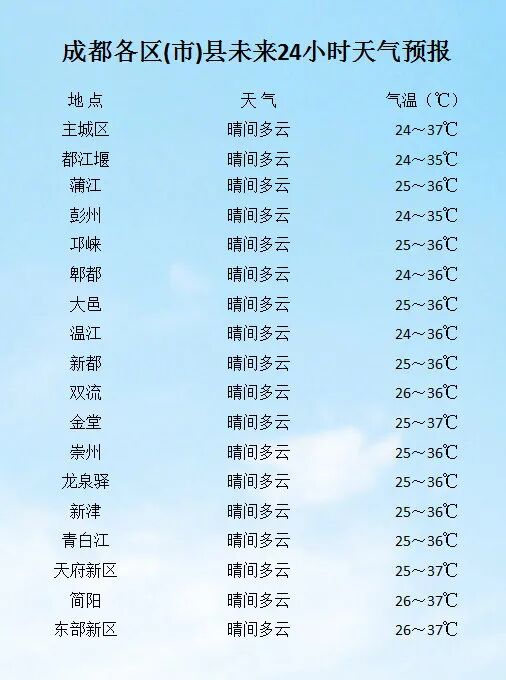 24小时内,盆地最高气温:37~39℃;最低气温:23~25℃。