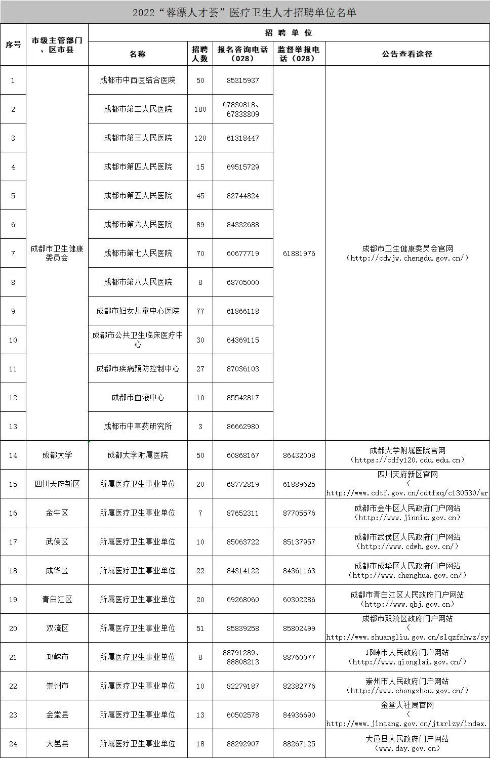 参加招聘的有成都市卫生健康委员会所属13家医疗卫生事业单位、成都大学附属医院及四川天府新区、金牛区、武侯区、成华区、青白江区、双流区、邛崃市、崇州市、金堂县、大邑县所属医疗卫生事业单位。