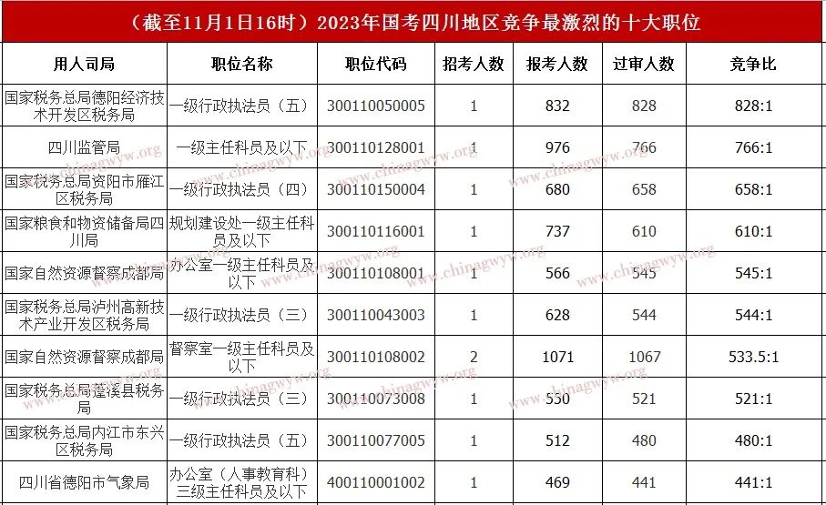其中国家税务总局四川省税务局报名人数最多,竞争也最激烈,在报名人数前十岗位中,就有6个来自税务局,其中竞争最激烈的岗位是“国家税务总局四川省税务局一级行政执法员(五)”,当前竞争比828∶1,排名第二的是财政部四川监管局,岗位竞争比766∶1。