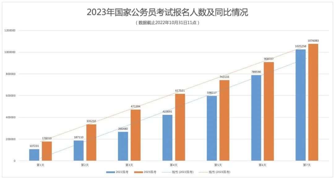 截至11月1日11时,全国总报名人数已突破100万,达到1076083人,已超2022年同期,资格过审最大竞争比达3585∶1。